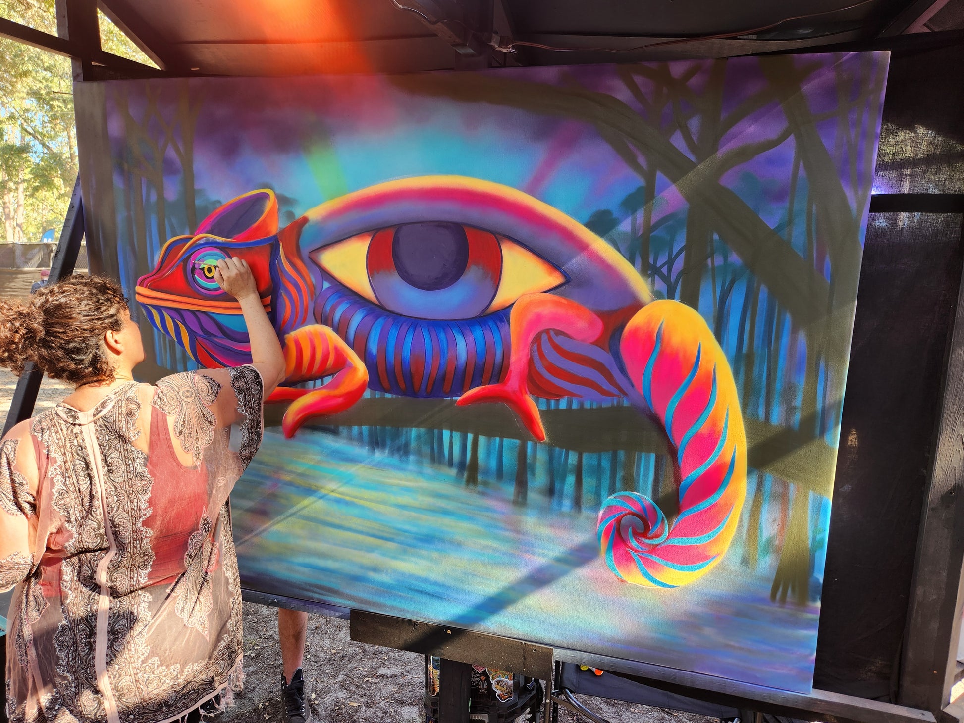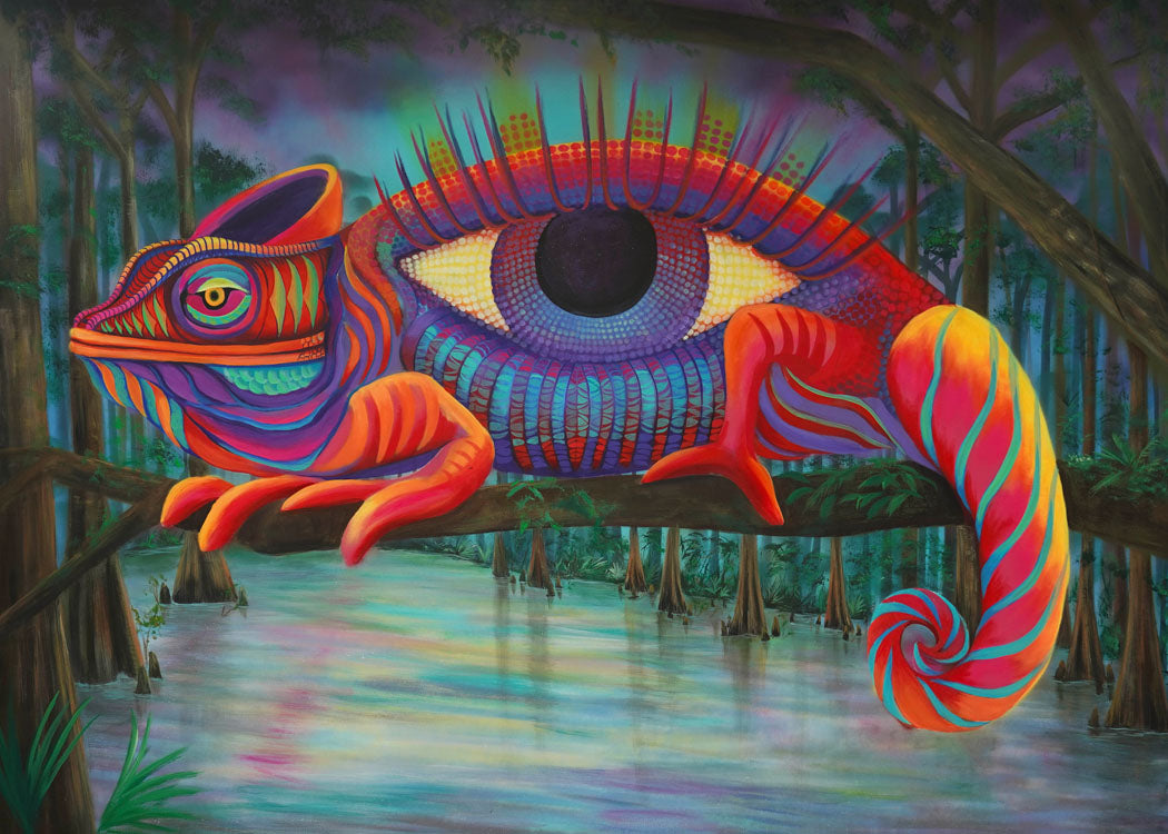 This Mural Maze paper print is of the original 5'x 7' painting. This piece titled 'Chameleon' was painted live by VioletIris in 2024 as part of the Mural Maze installation at Suwannee Hulaween.
